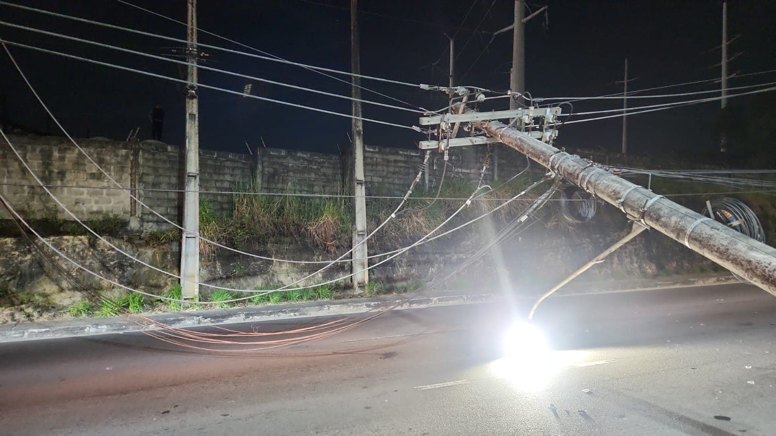 O poste derrubado ficou atravessado sobre a via, bloqueando totalmente a passagem de veículos. Agentes de trânsito foram acionados e orientaram os motoristas a fazer um retorno próximo e a evitarem a área até a liberação da pista.