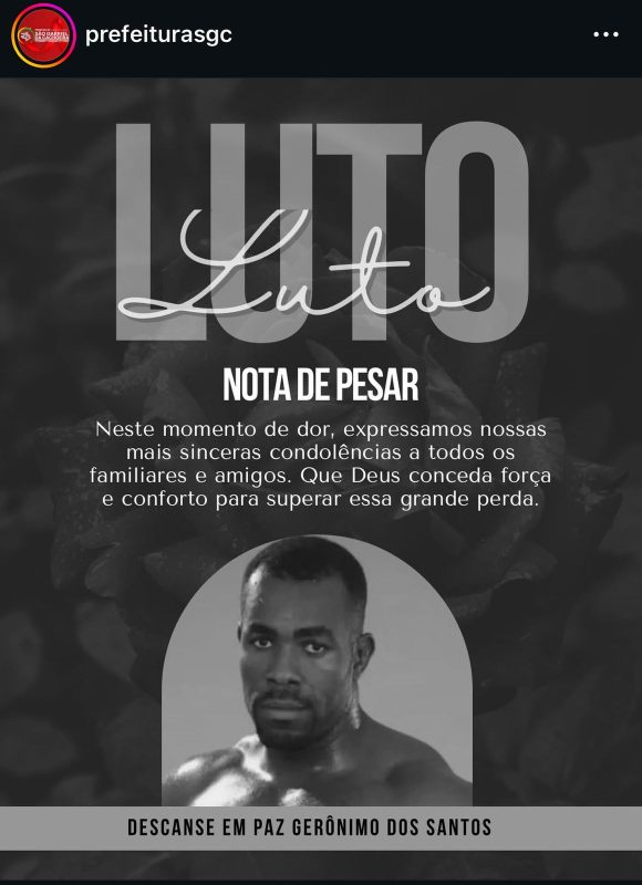 A informação foi confirmada no perfil da Prefeitura do município, que lamentou o ocorrido e se solidarizou com amigos e familiares do atleta. Além de lutador, Gerônimo também era sub-secretário de Segurança Pública de São Gabriel da Cachoeira.
