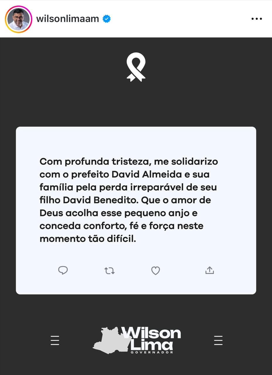 O governador Wilson Lima manifestou solidariedade ao prefeito David Almeida e desejou fé e força para enfrentar o momento difícil. Já o vice-governador Tadeu de Souza destacou que “a perda de um filho é uma dor que não encontra palavras, ainda mais quando se trata de uma vida tão breve, mas já tão infinitamente amada”, e encerrou a mensagem prestando condolências ao prefeito, à esposa e à família.