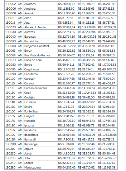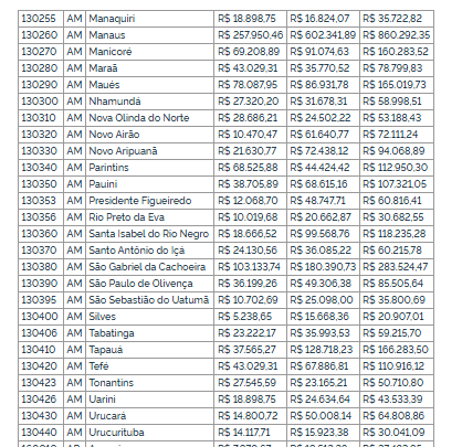 No Amazonas, Manaus será o município com maior volume de recursos, somando R$ 860.292,35, sendo R$ 257.950,46 destinados à vacinação nas escolas e R$ 602.341,89 para as demais ações. Entre os maiores repasses no interior estão São Gabriel da Cachoeira, com R$ 283.524,47, Barcelos, com R$ 210.801,88, Lábrea, com R$ 181.519,58, Maués, com R$ 165.019,73, Tapauá, com R$ 166.283,50, e Jutaí, com R$ 154.297,57.