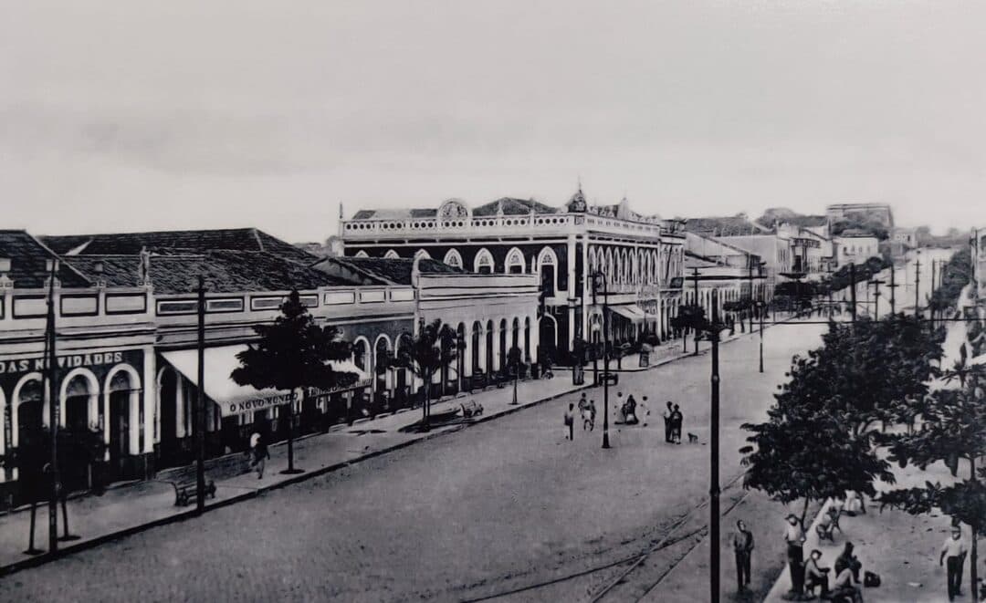 Imagem mostra uma parte da avenida Eduardo Ribeiro de antigamente, e alguns empreendimentos da época no então Centro de Manaus. Por ela passava o bondinho, quando a cidade entrava na era da modernização.