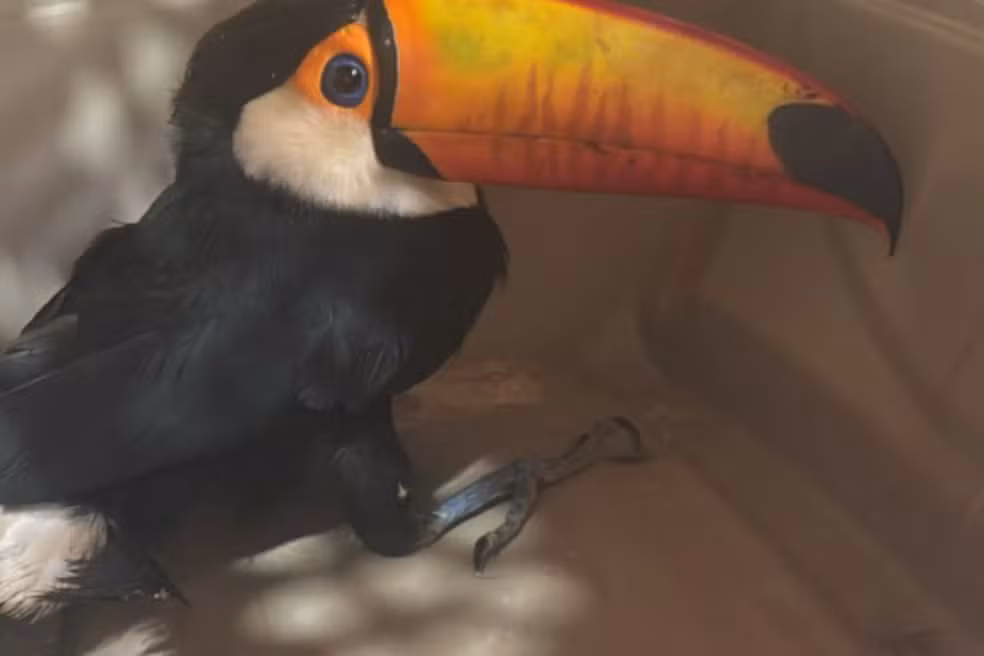 Um tucano foi encontrado com um ferimento grave no bico na zona rural de Indiana (SP). O animal, que apresentava sinais de agressão, foi localizado por um morador na sexta-feira (5/12) e entregue à Defesa Civil do município.