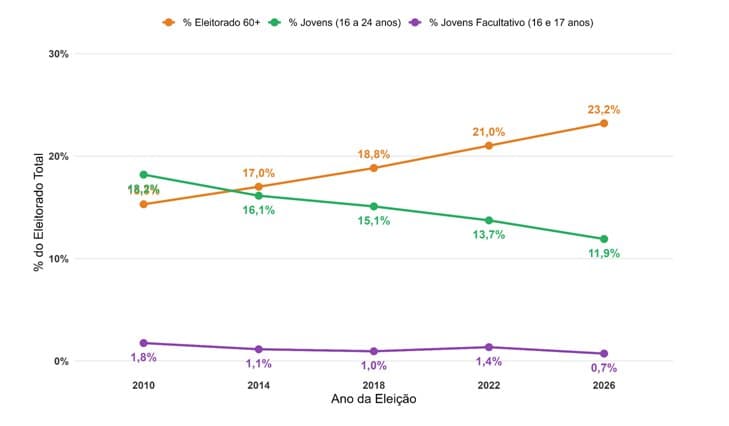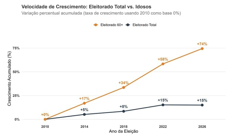 Enquanto o eleitorado total cresceu apenas 15% no mesmo período, os mais velhos passaram a representar quase um quarto dos votantes, criando um bloco eleitoral numeroso, mais previsível e, sobretudo, mais disputado.