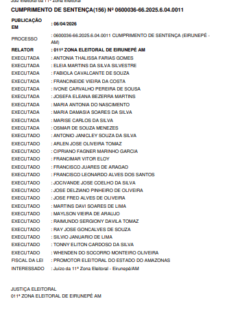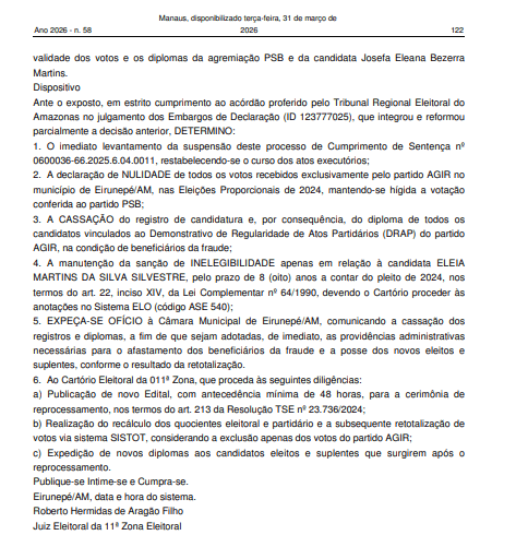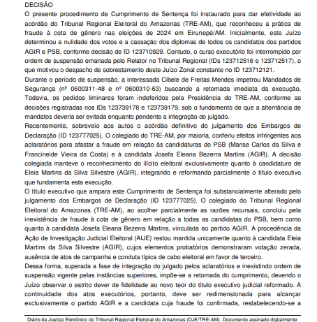 A medida consta no cumprimento de sentença nº 0600036-66.2025.6.04.0011, publicado em 6 de abril de 2026, e foi assinada pelo juiz eleitoral Roberto Hermidas de Aragão Filho, da 11ª Zona Eleitoral. A decisão segue entendimento do Tribunal Regional Eleitoral do Amazonas, que reconheceu fraude à cota de gênero no pleito.
