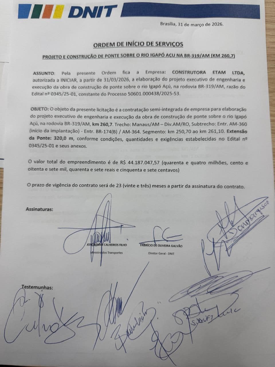 Outro avanço considerado estratégico é a autorização para o início da construção da ponte sobre o rio Igapó-Açu. A estrutura é apontada como essencial para garantir a trafegabilidade da rodovia durante todo o ano. O contrato ultrapassa R$ 44 milhões e prevê prazo de 23 meses para conclusão.