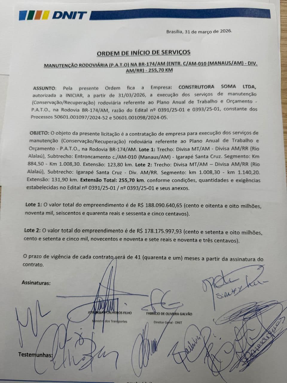Além das obras estruturantes, o DNIT também determinou o início de serviços de manutenção rodoviária em trechos da BR-174 e da própria BR-319. Os contratos, divididos em lotes, somam mais de R$ 360 milhões e incluem ações de conservação, recuperação e melhorias da malha viária no estado.