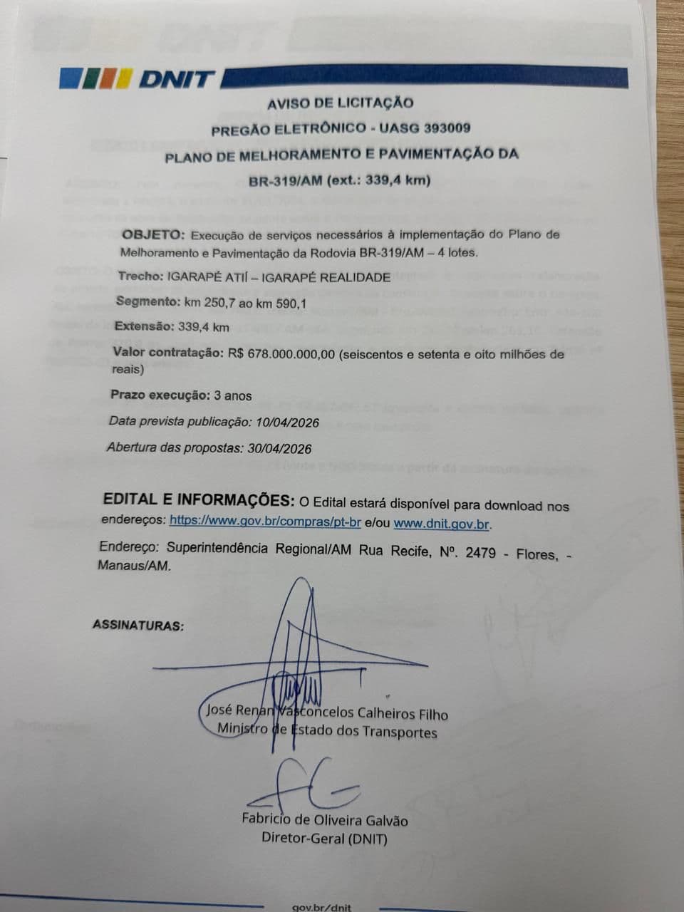 Entre as principais ações está o lançamento do edital para o plano de melhoramento e pavimentação de um dos trechos mais críticos da rodovia, entre o km 250,7 e o km 590,1, no segmento que liga Igapó-Açu a Igarapé Realidade. A obra abrange 339,4 quilômetros e tem valor estimado em R$ 678 milhões, com execução prevista em até três anos. A abertura das propostas está marcada para o dia 30 de abril de 2026.