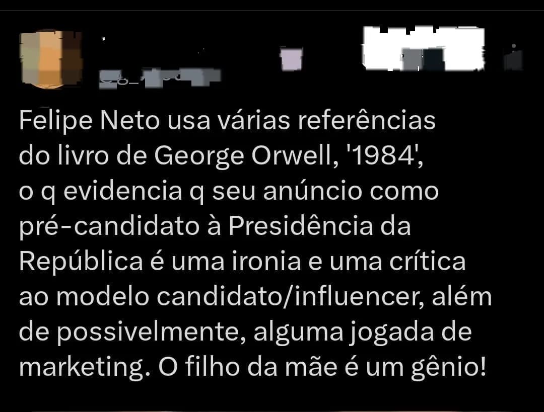No vídeo de esclarecimento, o empresário afirmou ter se inspirado na distopia “1984”, livro clássico do escritor inglês George Orwell, considerado um dos maiores alertas contra o totalitarismo já escritos. Felipe destacou que a literatura tem papel fundamental na formação crítica da sociedade: “A literatura é a maior arma que uma sociedade tem para enfrentar qualquer tipo de autoritarismo. Os livros têm o poder de transformar esse país, com certeza, para melhor.”