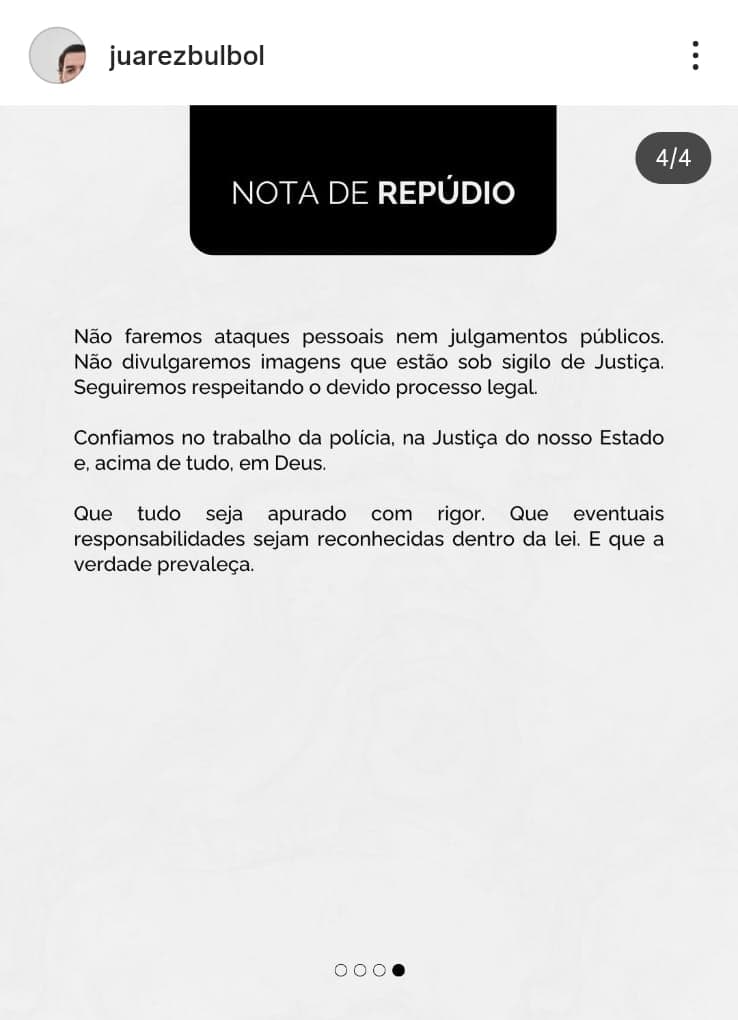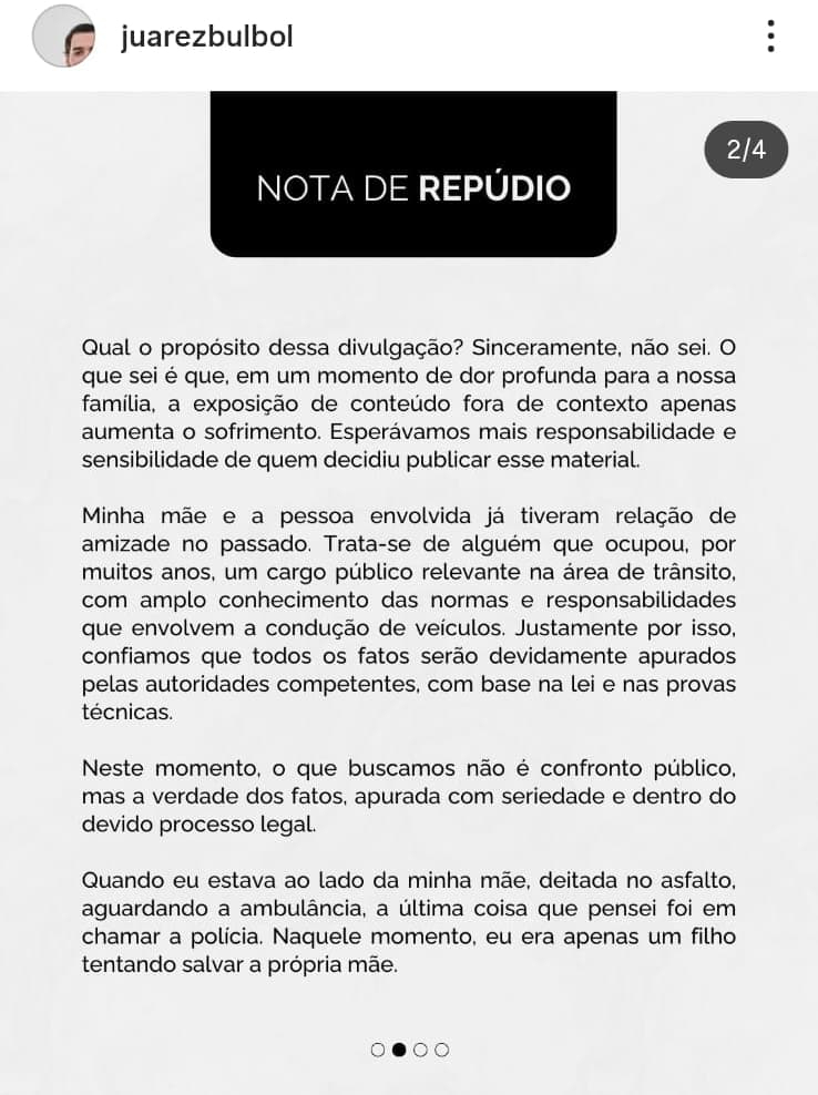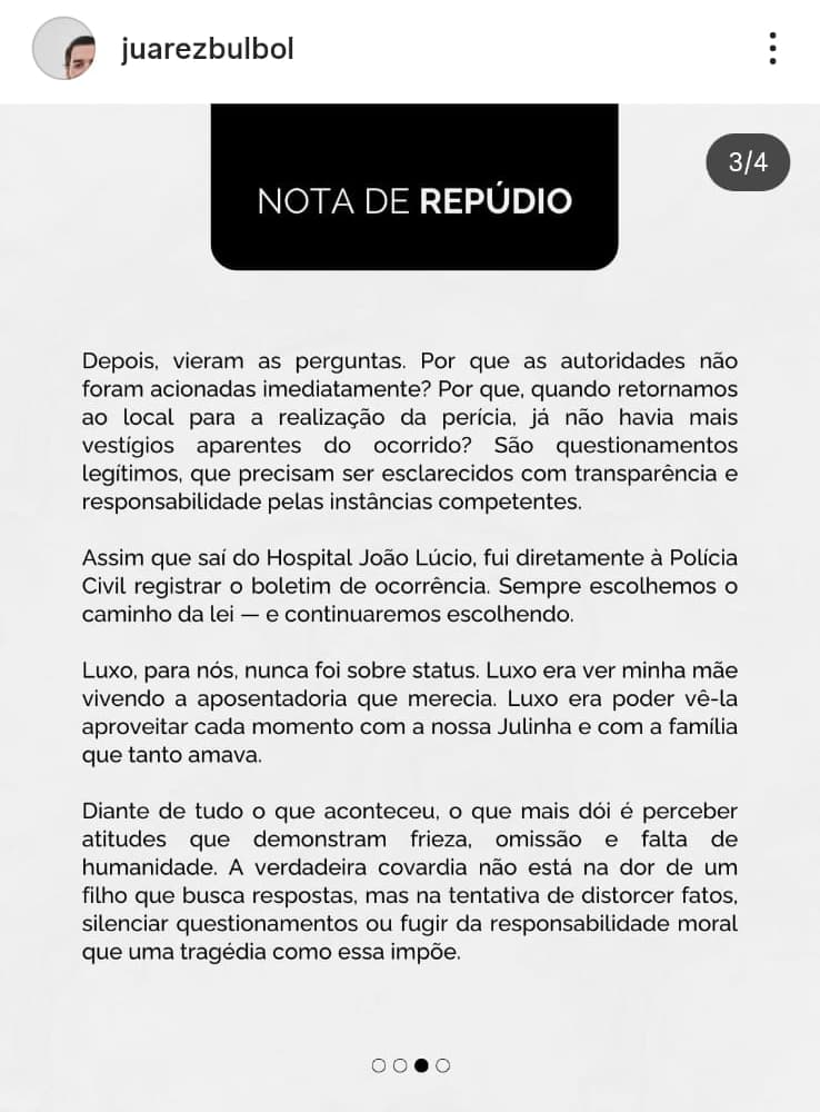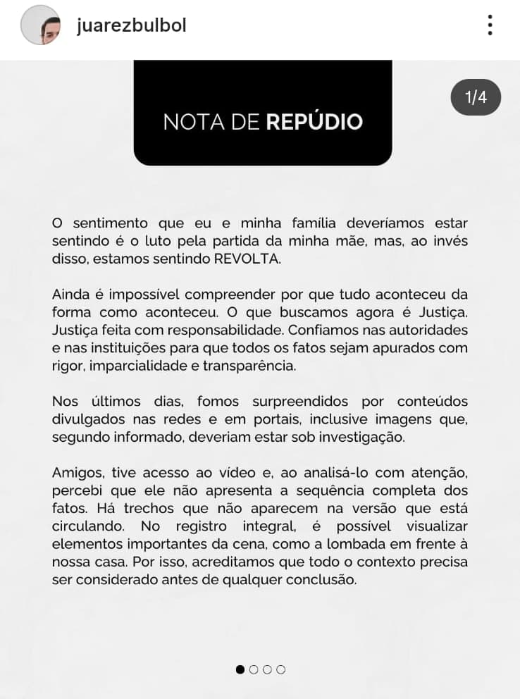 No texto intitulado “Nota de Repúdio”, Juarez declarou que, em meio ao luto, a família tem enfrentado a divulgação de conteúdos que, segundo ele, não apresentam a sequência completa do ocorrido. “O sentimento que eu e minha família deveríamos estar sentindo é o luto pela partida da minha mãe, mas estamos sentindo revolta”, escreveu.
