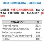 No cenário 1, em que enfrentaria somente Wanderlan Sampaio na disputa do pleito, Neto tem 53,4% das intenções de voto contra 34/2% do ex-prefeito do município. Nesta hipótese, o índice de decisão dos eleitores sobre a escolha do futuro prefeito de Autazes é de 78,7%.