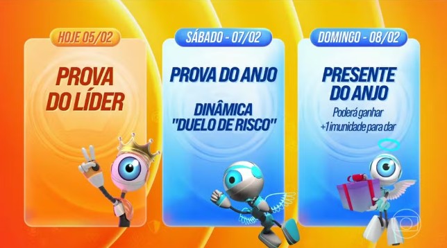 A semana ainda contará com a Prova do Líder, realizada na quinta-feira, e a Prova do Anjo no sábado. No domingo (8/9), o Anjo poderá receber um benefício extra, com a chance de conceder uma segunda imunidade. A formação do Paredão será tripla e incluirá emparedados pelo Duelo de Risco, pelo Líder, pelo voto da casa e por contragolpe.