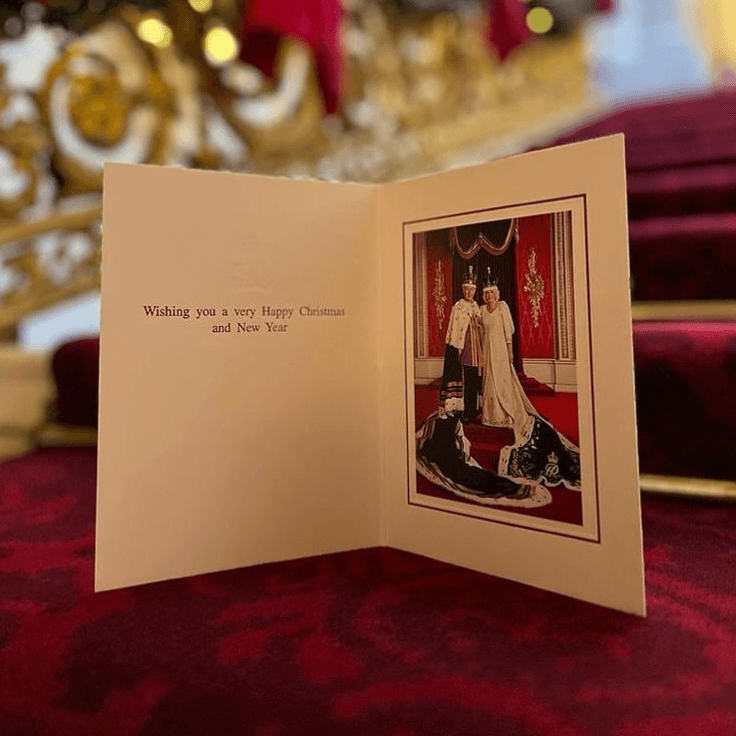 O cartão do rei Charles III apresenta uma fotografia tirada na Sala do Trono do Palácio de Buckingham após sua coroação em 6 de maio deste ano.