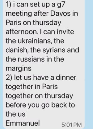 1) Posso organizar uma reunião do G7 depois de Davos em Paris na quinta-feira à tarde. Posso convidar os ucranianos, os dinamarqueses, os sírios e os russos à margem