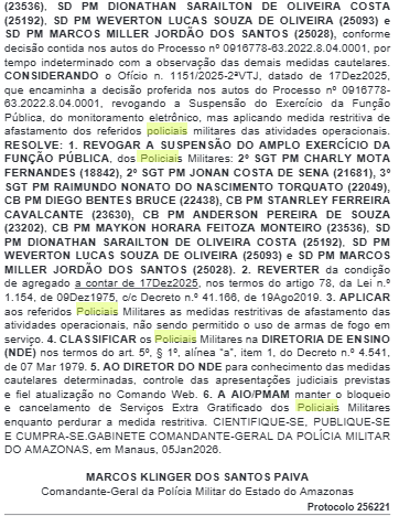 Em nota, a Polícia Militar informou “que a revogação publicada atende determinação da Justiça, que conforme decisão, solicitou que os policiais militares retornem ao trabalho na corporação em atividades administrativas e sem utilização de armas de fogo”.