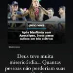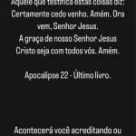 Michelle então compartilhou diversos versículos bíblicos e encerrou dizendo que as profecias descritas acontecerão “você acreditando ou não”. A ex-primeira-dama ainda compartilhou uma notícia sobre os problemas enfrentados pelo trio de Ivete Sangalo e declarou: “Deus teve muita misericórdia… Quantas pessoas não perderiam suas vidas? Não brinquem e nem desafiem Deus”.