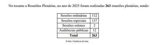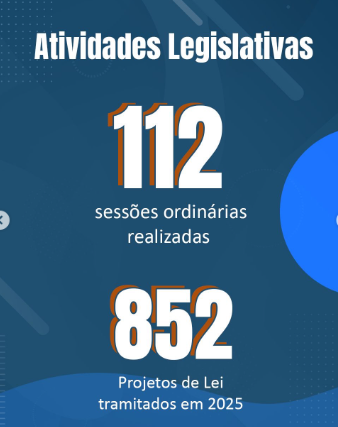 Na Câmara Municipal de Manaus, os números divulgados indicam a realização de 112 sessões ordinárias ao longo do ano, além da tramitação de 852 projetos de lei em 2025.