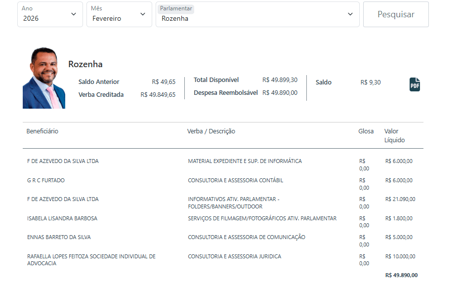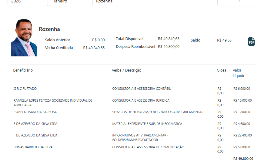 Em janeiro, os números já impressionavam. Cristiano D`Ângelo (MDB) gastou R$ 21.415,09 em materiais gráficos; Thiago Abrahim (MDB), com R$ 20 mil, e Rozenha (PSD) com R$ 22,4 mil. Wanderley Monteiro (UB) chamou atenção ao somar R$ 30 mil, incluindo gastos com divulgação digital ou informativos parlamentares.