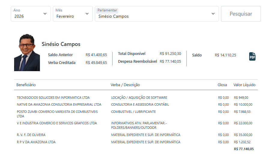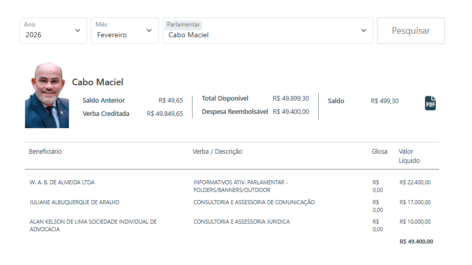 Fevereiro elevou ainda mais o ritmo. Cabo Maciel (PL) passou dos R$ 22,4 mil, enquanto Comandante Dan (Republicanos), Sinésio Campos (PT) e Abdala Fraxe (Avante) também tiveram os R$ 22 mil em informativos. Cristiano D`Ângelo (MDB) e Alessandra Campelo (PSD) com de R$ 21 mil e Rozenha (PSD) chegou a R$ 21.090.