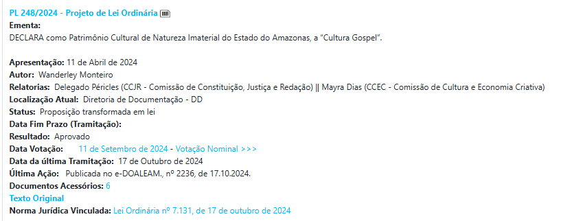 Entre os exemplos estão propostas como Dia do Despachante de Veículos, reconhecimento da Arena da Amazônia e da Ponte Jornalista Phelippe Daou como patrimônio cultural imaterial e datas voltadas a categorias profissionais.
