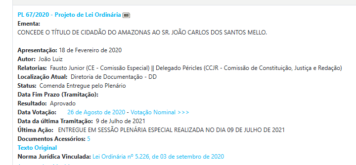 Outro ponto recorrente no mandato é a concessão de títulos de cidadão amazonense. Mesmo sendo uma prática comum nas casas legislativas, o uso frequente desse tipo de proposta reforça a percepção de um mandato mais voltado ao reconhecimento simbólico do que à produção de políticas públicas estruturantes.