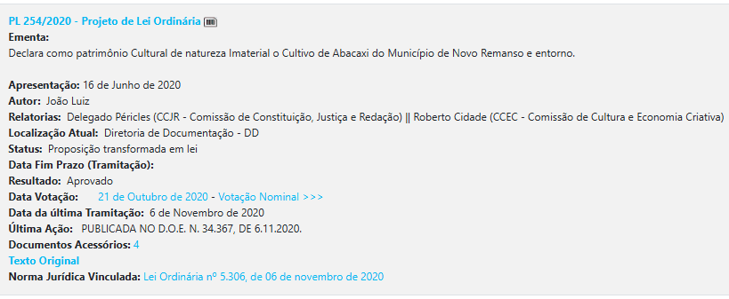 O padrão se manteve nos anos seguintes. Em 2020, surgiram iniciativas como o reconhecimento do cultivo de abacaxi de Novo Remanso como patrimônio cultural. Em 2021, o deputado propôs o Dia Estadual de orações e jejum.