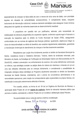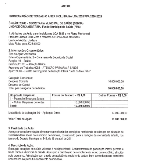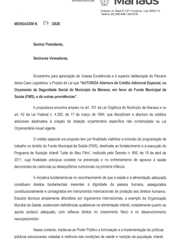 A Prefeitura de Manaus encaminhou à Câmara Municipal (CMM) o Projeto de Lei nº 286/2026, que autoriza a abertura de crédito adicional especial no orçamento da seguridade social do município. A proposta, enviada por meio da Mensagem nº 007/2026, prevê a destinação de R$ 10 milhões ao Fundo Municipal de Saúde (FMS), com impacto direto em ações da rede pública, incluindo o programa “Leite do Meu Filho”.