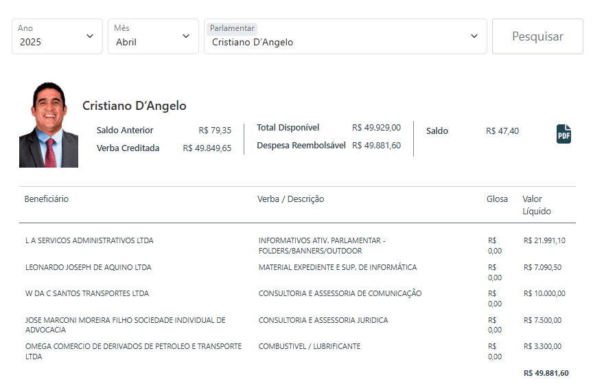 Já na utilização da cota parlamentar ao longo de 2025, o deputado apresenta padrão de gastos praticamente integral mês a mês, com forte concentração em serviços de comunicação, produção de material gráfico e assessorias. A constância dessas despesas indica organização do gabinete e investimento na divulgação das atividades parlamentares.